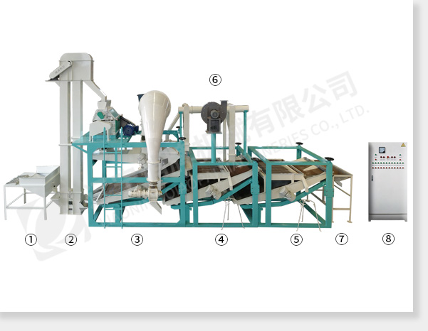 上料斗斗式提升機(jī) 脫殼、風(fēng)選、分選主機(jī) 籽米復(fù)選機(jī)1 籽米復(fù)選機(jī)2 風(fēng)力回料系統(tǒng) 接料斗 電氣控制柜
