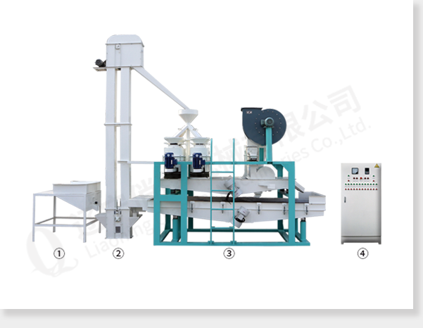 приёмный бункер  ковшовый элеватор главная машина (шелушитель, вибросито для удаления шелухи и вибросито для сепарации нелущённой семечки и ядра) ④электрический управляющий шкаф